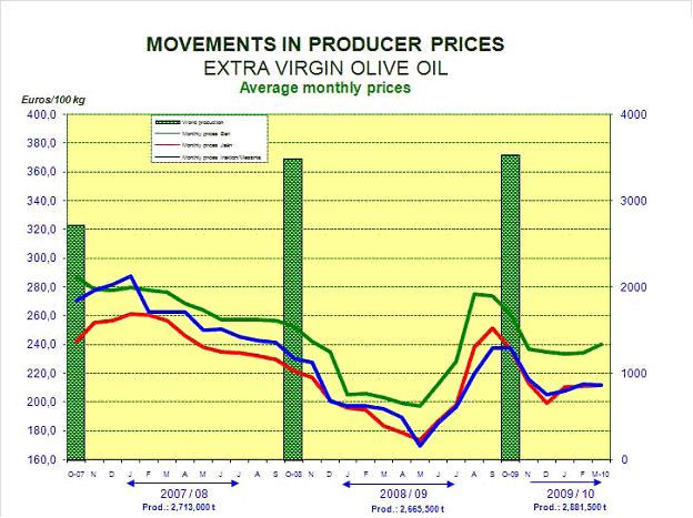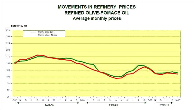 Несмотря на 40-процентное падение цен из-за кризиса, в целом за 2001-2008 гг. их уровень существенно повысился. Уже в июне-октябре 2009 г. мировые цены на оливковое масло начали восстанавливаться и достигли уровня 3400-3800 долл. за тонну, однако стагнация помешала им вернуться к максимумам 2006 г. и даже заставила несколько опуститься. Цены на техническое оливковое масло (Virgin Lampante) за рассматриваемый период коррелировали с развитием ценовых параметров сегментов масла высших сортов. Цены на масло из шрота (Pomace), особенно на потребительский сорт и смеси с маслом Virgin, продемонстрировали большую волатильность. После достижения максимума в 2005 г. и в первом квартале 2008 г. (2000 – 2300 долл. за тонну), они снова снизились до уровня 2003-2004 гг. и сохраняются на этом уровне по настоящее время.