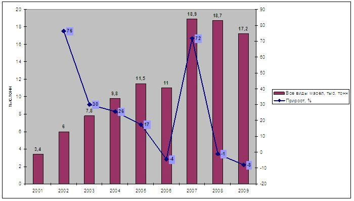 Согласно статистическим данным, в 2010 г. отмечается активное восстановление российского рынка оливкового масла. По прогнозам специалистов компании «Академия Сервис» российский импорт оливкового масла (и емкость рынка) в 2010 г. увеличится в натуральном выражении на 15-20% и достигнет 20 тыс. тонн, что в стоимостном выражении составит 75-80 млн. долл.