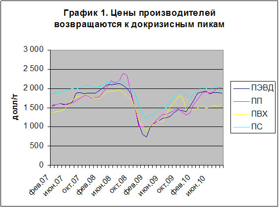 Нынешняя ситуация на полимерном рынке России подавляющим большинством переработчиков оценивается как сложная, несмотря на рост рынка. Главная причина этого – резкий, почти до докризисного уровня рост цен на основные полимеры (см. график 1), а это 70-80% себестоимости изделий. Полностью переложить это бремя на конечных потребителей переработчики не могут. Результатом является снижение рентабельности, что особенно болезненно на рынках с высокой конкуренцией, вроде полиэтиленовых пакетов. Однако даже для более устойчивых сегментов переработки полимеров ценовые «американские горки» являются проблемой, затрудняющей финансовую деятельность, не говоря об инвестиционных планах.