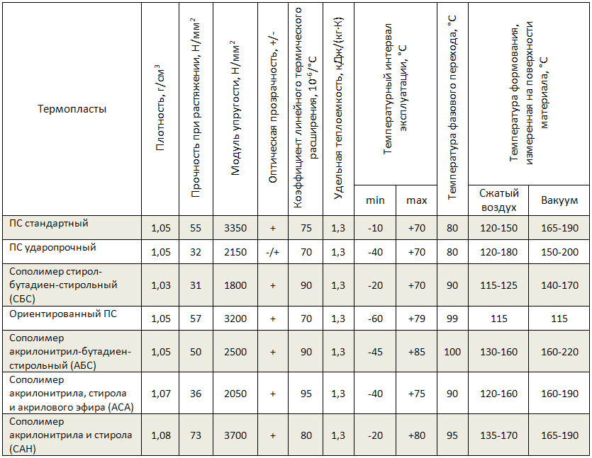 С развитием сетей быстрого питания, а главное - сетей магазинов самообслуживания, растет популярность упаковки из вспененного ПС (ВПС). Она экономична, надежна, удобна. Хотелось бы отметить преимущества и недостатки этого вида упаковки и тенденции развития рынка в ближайшее время. ВПС - это специальным способом вспененный полимер, содержащий мельчайшие пузырьки воздуха. Существует 2 вида аналогичного материала: пенопласт (вспенивающийся ПС) и экструдированный ВПС. Отличаются они в первую очередь способом изготовления. Первый получают из гранул особых марок ПС путем нагревания сырья паром в специальных формах. Рассматривая такую упаковку, можно увидеть своеобразные «шарики». Второй вид - экструдированный ВПС - изготавливается из гранул ПС общего назначения. На этапе экструзии специальными методами получают вспененную ленту ПС, которую впоследствии формируют в определенные изделия. Формование изделия происходит методом термоформования. Свойства ПС-термопластов, важные в процессе термоформования, приведены в таблице.