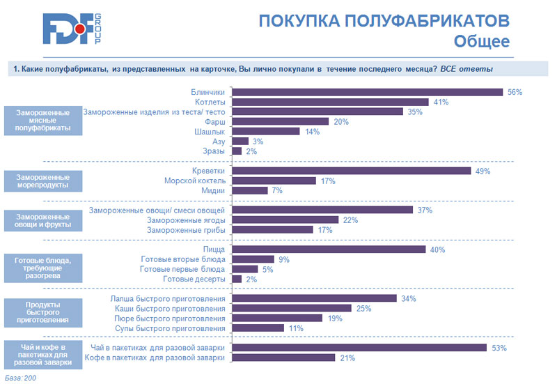По результатам исследования FDF Group, проведенного специально для Sostav.ru, можно сделать вывод, что популярность полуфабрикатов у посткризисного потребителя не снизилась, при этом спрос на приготовленную в домашних условиях пищу по-прежнему преобладает.