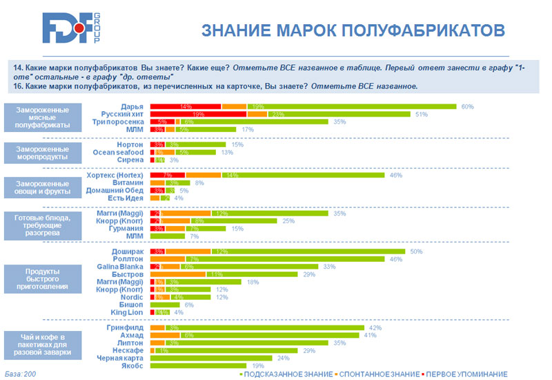 Что касается готовых блюд, то здесь уровень знания брендов на среднем уровне, лучше известны зонтичные бренды, рекламная поддержка достаточно активная. Наиболее известные марки – «Магги» (35%) и «Кнорр» (25%). Лояльность к «новым» брендам значительно выше, чем к существующим давно.