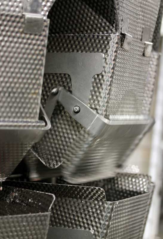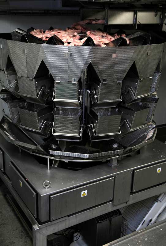 Модель RS-214/70 оснащена вместительными бункерами и широкой воронкой cброса, что позволяет избегать «пробок», образуемых крупными кусками при выгрузке, и обеспечивает высокую производительность. Тем не менее, при обработке отдельных кусков с большим весом даже сверхточный весовой дозатор Ishida может оказаться в ситуации, когда невозможно подобрать комбинацию куриных четвертей под общий заданный вес упаковки. В таком случае срабатывает уникальная система возврата, автоматически перемещающая продукт по рециркуляционному конвейеру в начало цикла загрузки в дозатор.