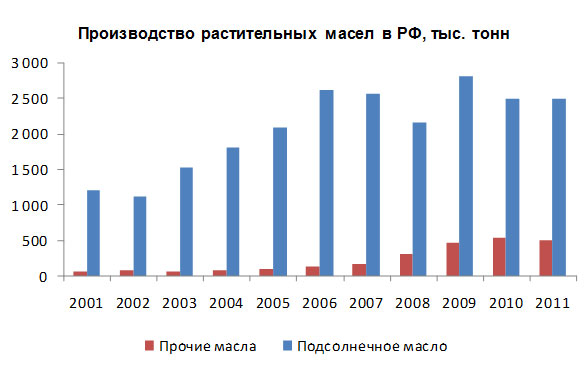 Важной тенденцией в развитии российского рынка масложирового сырья является его диверсификация и многократный рост производства и переработки альтернативных масличных культур, таких как лен, соя и рапс. В 2001 г. производство прочих растительных масел, помимо подсолнечного, составляло 74 тыс. тонн, а к 2011 г. оно достигло 507 тыс. тонн.