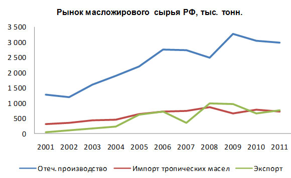 Масштабный рост отечественного производства и переработки растительных масел позволил полностью удовлетворить внутренний спрос на масла и продукты их переработки и наладить стабильный экспорт излишков производства. Если в 2001 г. из России было экспортировано всего 43 тыс. тонн растительных масел, то в 2011 г. экспорт составил уже 630 тыс. тонн растительных масел для промышленной переработки. В результате, на российском рынке с 2008 г. установился устойчивый баланс по объемам экспорта и импорта масел.