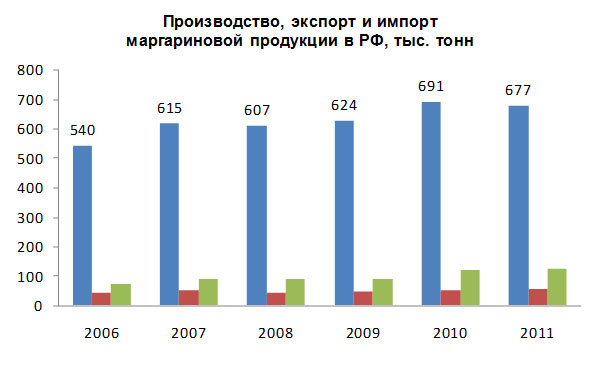 Отечественное производство промышленных маргаринов и жиров специального назначения в 2006 г. составляло порядка 540 тыс. тонн, а к концу 2011 г. оно увеличилось на 25% -- до 677 тыс. тонн.