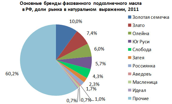 Сегодня рынок фасованного подсолнечного масла в России характеризуется высоким уровнем конкуренции. По оценке «УкрАгроКонсалт», до 55% рынка занимают бренды пяти ведущих производителей: «Аведовъ», «Золотая семечка», «Злато» и «Юг Руси» от одноименной компании; «Олейна», «Идеал» и «Масленица» от Bunge; «Слобода» производства «ЭФКО»; «Затея» от компании «Астон»; «Россиянка» от «Солнечных продуктов».