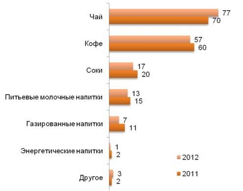 Предпочитают запивать свой перекус россияне чаще всего чаем, кофе или соком. Женщин больше среди любителей кофе, тогда как мужчины чаще отдают предпочтение чаю. Со снижением возраста респондентов возрастает число тех, кто употребляют питьевые молочные и газированные напитки. А вот при увеличении возраста респондентов растет доля поклонников кофе.