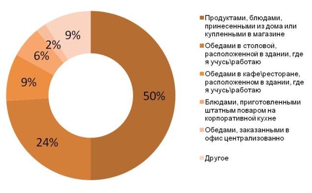 Более половины россиян (53%) тратит ежедневно на перекусы менее 100 рублей. Треть от - от 100 до 200 рублей. В среднем в день опрошенные тратят порядка 111 рублей на перекусы на рабочем месте. Как и в ситуации с перекусами, еду для обедов большинство опрошенных (50%) приносят с собой из дома или приобретают их в магазине. Каждый четвертый обедает в столовой, которая расположена в том здании, в котором они работают/учатся. А вот рестораны и кафе пользуются меньшей популярностью. Лишь 9% обедает в ресторанах и кафе, расположенных в их здании.