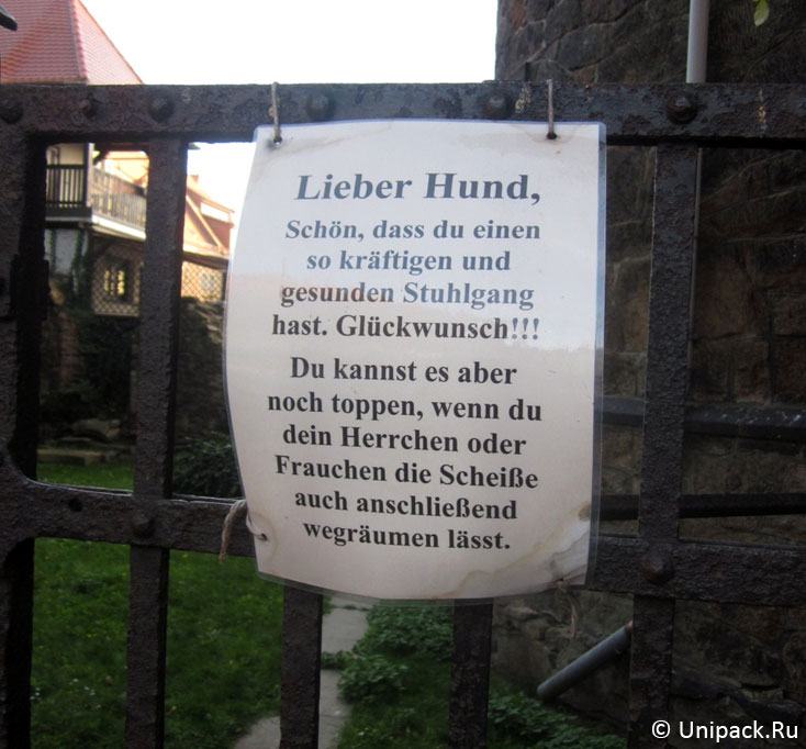 Еще одна разновидность отходов – органические. Для них тоже специальные контейнеры, в которые выбрасываются различные пищевые отходы, кофейные фильтры, чайные пакетики, садовый мусор и пр. На оранжевых веселых бачках в Берлине нарисована маленькая собачка и еще более маленькая кучка на земле. Это значит, что контейнер принимает и подобные органические отходы. На одном из таких контейнеров была инструкция, которая в переводе звучит примерно так: «Собачьи дела собираем, заворачиваем, кладем – и готово!». Собаки, видимо, досаждают многим добропорядочным немецким гражданам, потому что в Баутцене на калитке, ведущей в руины церкви Мёнхскирхе, построенной в тринадцатом веке францисканцами, висит интересное обращение:
