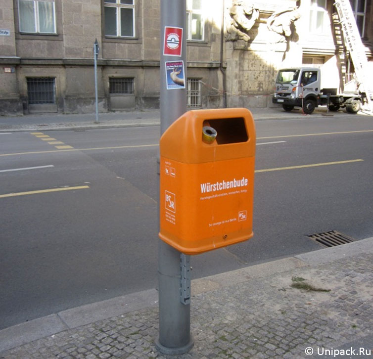 В Берлине сознательность прохожих воспитывают маленькие оранжевые мусорные контейнеры. На них красуются горделивые сообщения о том, что такие оранжевые бачки есть только в Берлине. На каждом из них что-нибудь написано. На этом, например, надпись Würstchenbude (Сосисочная).
