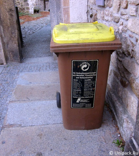 Автору этих строк недавно пришлось побывать в Германии, в которой, кстати, один из самых высоких в Европе показателей степени переработки упаковочных отходов. Там принято сортировать мусор по разным контейнерам в целях последующей его переработки. Это не просто считается хорошим тоном, это закон, и все население страны должно вносить свой вклад в создание экономики замкнутого цикла. Причем гражданам предлагается сортировать мусор не только дома, но и в общественных местах, на вокзалах и в аэропортах. Поэтому несколько непривычно видеть множество разных уличных контейнеров на улицах немецких городов. Известно, что для отходов упаковки в Германии чаще всего используются желтые контейнеры. Вот такие, как на берлинской улице. На них написано «легкая упаковка» и изображен знак «Зеленая точка» – международный знак поддержки производителем программ по утилизации и переработке упаковки.