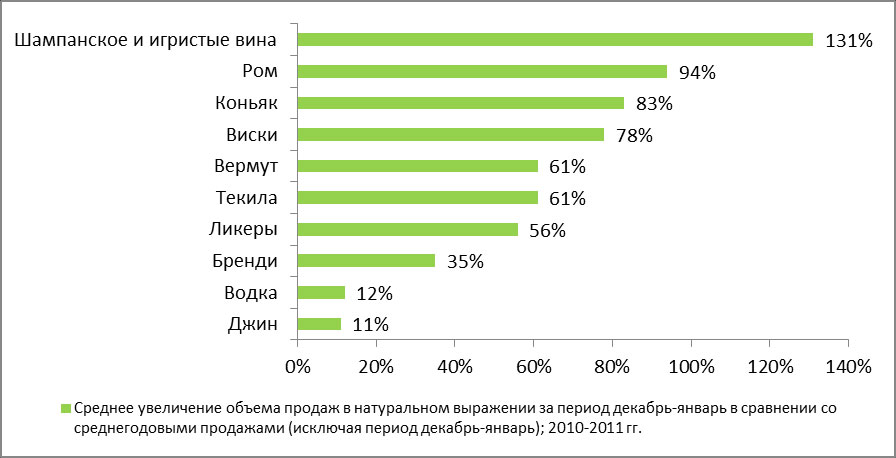 Все без исключения крепкие спиртные напитки демонстрирует рост объемов продаж в новогодние праздники. В высокий праздничный сезон происходит перераспределение потребительских предпочтений в сторону премиального сегмента: потребители не готовы экономить на крепком алкоголе и стараются покупать более дорогие продукты. Безусловными лидерами роста являются шампанские и игристые вина, ставшие неотъемлемой частью традиционного новогоднего стола: до 70-80% годовых продаж этих категорий приходится на декабрь-январь.