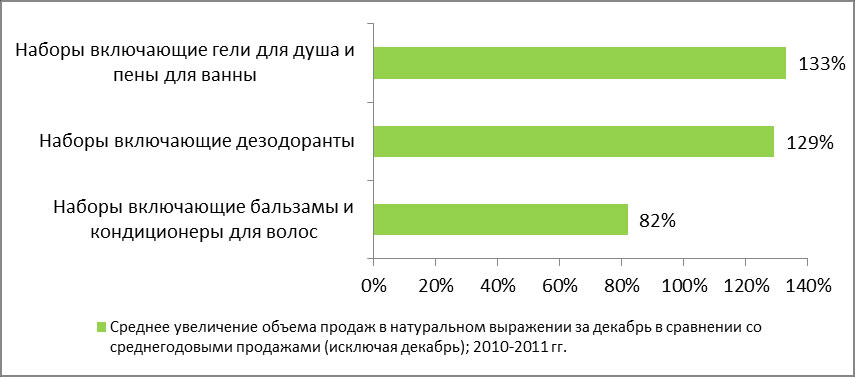 Алкогольные напитки и шоколадные конфеты чаще всего покупаются потребителями «на стол», в то время как наборы, включающие в себя гели для душа, пены для ванн, дезодоранты являются одними из самых распространенных подарков. Предновогодний и новогодний периоды характеризуются всплеском промо-акций и резким ростом продаж различных наборов (дезодоранты, гели для душа, пены для бритья и т.д.), который сохраняется вплоть до марта.