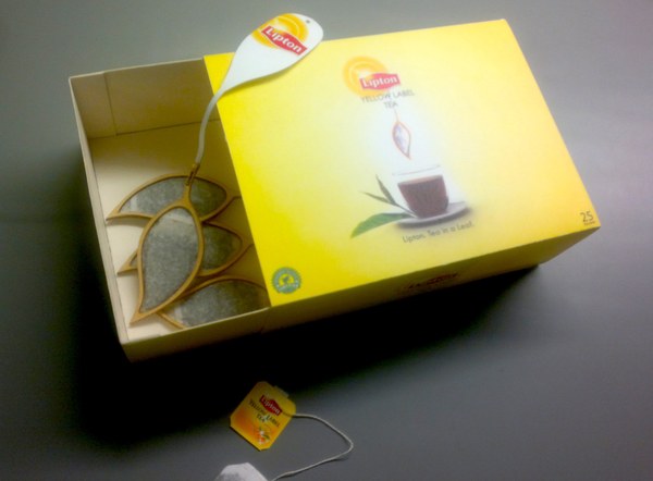 Концепцию эко-упаковки чая для вымышленной компании Tea Hugger разработал дизайнер из Англии Hannah Jackson. Упаковка выполнена из переработанного картона и собрана с помощью специальной вырубки с "ушками", которая не требует использования клея.