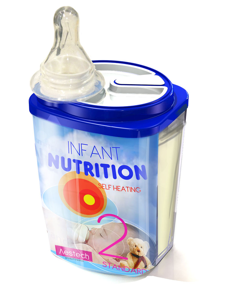 Новая инновационная упаковка, разработанная недавно созданной голландской компанией Aestech, это саморазогревающаяся упаковка для полужидкой пищи, прежде всего, детского питания. В отличие от существующей саморазогревающейся упаковки, содержащей предварительно перемешанные напитки, в данной упаковке имеется отдельный отсек, в котором содержится сухая молочная смесь.