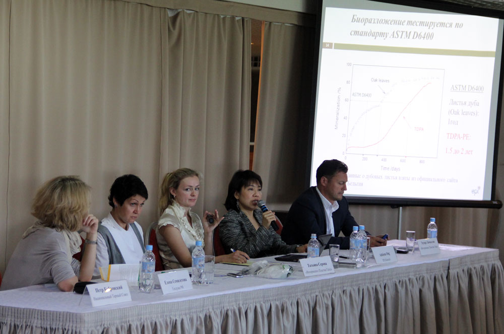 Девятнадцатого июня в рамках деловой программы выставки RosUpack 2013 прошла конференция «Оксобиоразложение – миф или научная технология? Методы контроля качества биоразлагаемой упаковки из полиэтилена. Перспективы применения биоразлагающих добавок в изделиях из полистирола и полипропилена», организованная компанией EPI (Канада) и ООО «Интернешнл Пластик Гайд» (Россия). С докладами на мероприятии выступили Аделин Онг (Adelene Ong), технический директор EPI, Петр Бобровский, вице-президент Национального тарного союза, Эдуард Замыслов, технический директор «Интернешнл Пластик Гайд».
