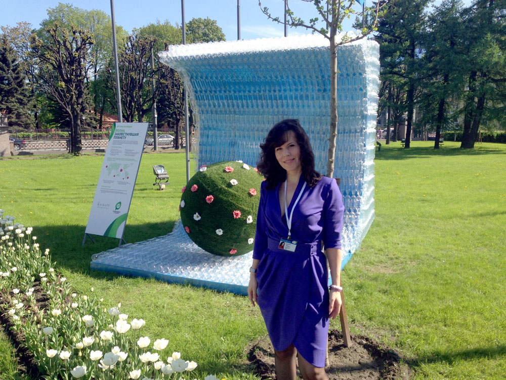 Эколог, инициатор проекта «Изумрудная планета» Елена Шаройкина на фоне арт-инсталляции «Волна, захлестнувшая планету», выполненной из 3000 пластиковых бутылок.