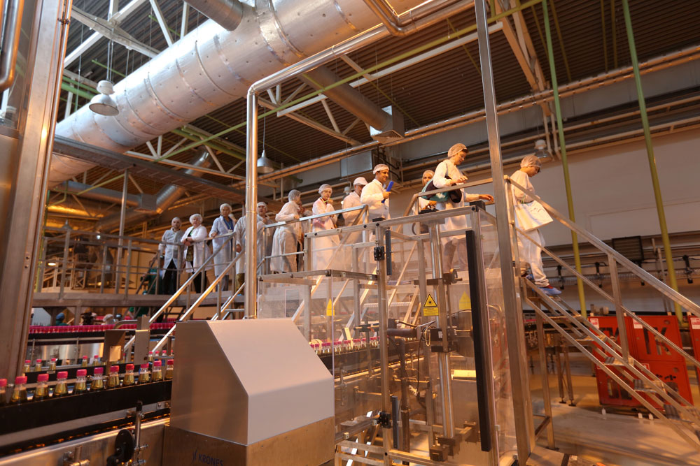 Главное, что бросается в глаза на заводе – это чистота. Чтобы попасть на производство, надо пройти через турникет. Во время прохождения через него подошвы ботинок стерилизуются в специальном растворе. Все гости надевают одноразовые халаты и шапочки. Персонал завода полностью переодевается. Гигиена превыше всего.