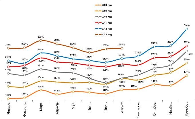 Диаграмма 1. Динамика индекса повседневных потребительских расходов россиян за весь период наблюдений, январь 2008 – август 2013