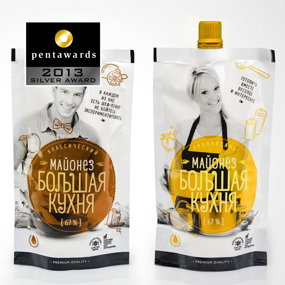 Новый бренд майонеза — «Большая кухня», разработан агентством Plenum Brand Consultancy. Отметим, что это смелое и оригинальное решение для российского рынка майонеза. Сегодня майонез воспринимается как атрибут традиционной, «советской» кухни, и большинство продуктов на рынке подыгрывают этому восприятию. В противовес этой идее, бренд «Большая кухня» ориентируется на современность и молодых горожан, которые увлекаются готовкой. Упаковка максимально разгружена от ожидаемых категорийных клише и привлекает внимание покупателя, прежде всего, визуальными деталями и оригинальным графическим решением. Еще одна тенденция, положенная в основу идеи нового бренда — это совместное приготовление пищи («Готовить вместе - веселее и интереснее!»).