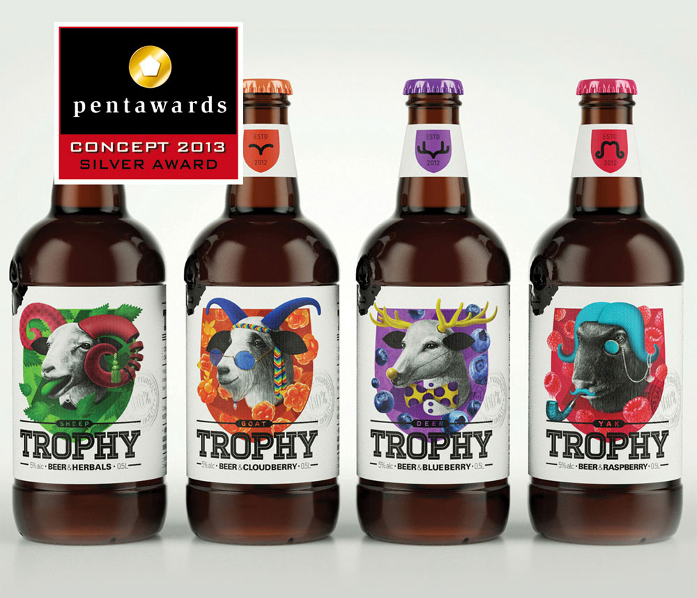 Словно сошедший со страниц всех дизайн-блогов сразу, «Trophy» выглядит как аллюзия на пиво «Охота». Ироничные иллюстрации, ассортимент символических рогов на кольеретке, дуло на штрихкоде — все подчеркивает идею охоты. С древнейших времен охота являлась одним из основных занятий человека, а за минувшие столетия сформировался отдельный вид охоты – трофейная, целью которой является добыча особо интересных экземпляров, таких как пиво Trophy в уникальной упаковке со спецэффектами.
