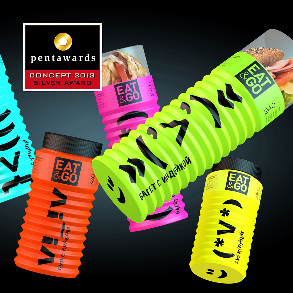 Eat&Go — это готовый обед для студентов. Разработчики бренда — студенты Британской высшей школы дизайна Ольга Гамбарян, Диана Гибадулина, Александр Кищенко и Андроник Полоз. «Мы придумали упаковку для сэндвичей и супов, которые можно есть на ходу. Упаковка представляет из себя пластиковую трубку, которую удобно сжимать. Принцип тот же, что у гармошки в трубочке для сока.