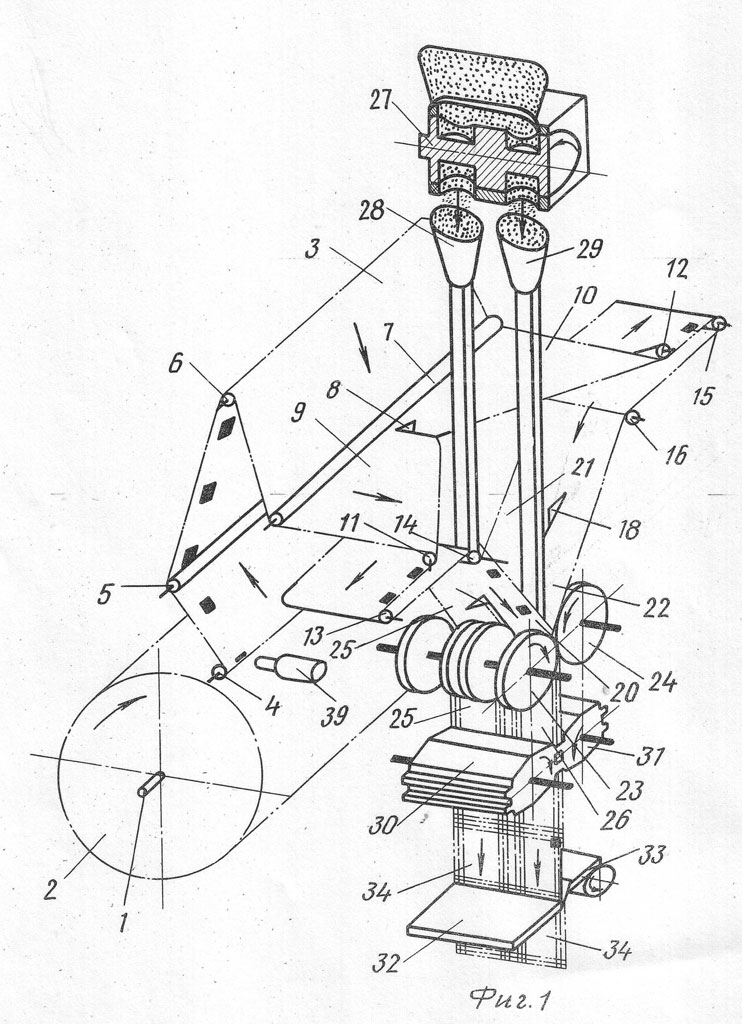 Апологеты «вертикального направления», считаю, провели первоначально бόльшую работу. И как ее результат, было получено а. с. № 5165791. Авторами изобретения были очень сильные конструкторы: среди них руководители (тогдашний и будущий) отдела, в котором непосредственно создавалась техника, первый и последующий ведущие конструкторы этого типа оборудования, да и просто люди, очень хорошо знающие и умеющие создавать фасовочно-упаковочное оборудование. Стоило бы отметить описание изобретения в данном свидетельстве как наиболее полное и интересное среди множества других, касающихся этого вида техники. Описывалось многое: и технологическая схема получения и наполнения тары, и кинематика оборудования. Но защищенная охранным документом часть технологического процесса оказалась не столь велика, она касалась, прежде всего, соотношения действия между исполнительными механизмами и связи между ними. Но эта часть существенна. Для подтверждения полноты описания представим два из четырех рисунков, приведенных в документе.