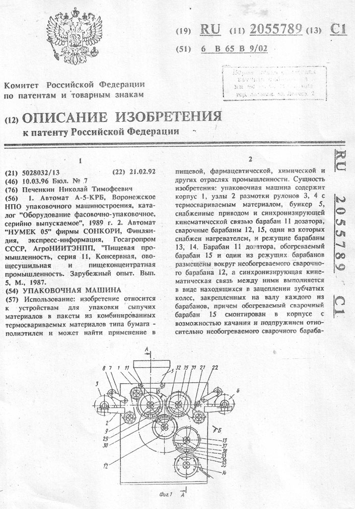 10 марта 1996 года в официальном бюллетене патентного ведомства страны была опубликована формула изобретения, защищенного патентом РФ № 2055789 «Упаковочная машина»4. Автор изобретения и патентообладатель Н. Т. Печенкин, приславший заявку 21.02.92, предлагал некоторые коренные изменения в конструкцию упаковочной части фасовочного автомата.