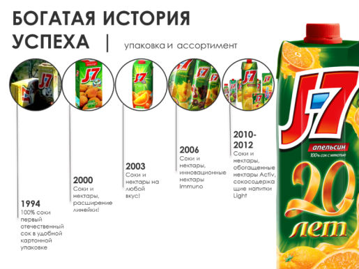 1994 – год основания российского рынка пакетированных соков, когда с конвейера Лианозовского молочного комбината компании «Вимм-Билль-Данн» сошел первый, герметично упакованный картонный пакет сока J7. В то время на продовольственном рынке России еще не существовало брендов, и отечественные производители предпочитали продавать соки в трехлитровых стеклянных банках. J7 стал первым национальным брендом, который предложил российским покупателям вкусные натуральные соки высокого качества в удобной упаковке Tetra Pak. Изначально продуктовая линейка состояла из семи вкусов, что и легло в основу названия бренда J7 – Seven Juices (семь соков).