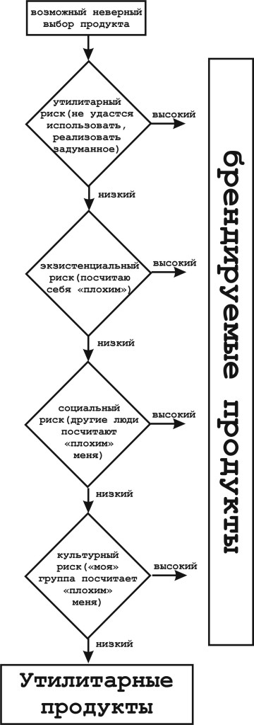 Если риски невелики (самооценка не пострадает, а самое худшее что сможет произойти – возникнут некоторые незначительные непредсказуемые нюансы в процессе использования), то и сложного выбора нет. Потребитель будет выбирать лишь тот продукт, который покажется ему просто «лучшим» в конкретной ситуации. И чем меньше существенная разница между продуктами, тем более незначительными критериями будет руководствовать в выборе потребитель. Разумеется, когда все продукты плюс-минус одинаковы и не несут рисков, сильно переплачивать потребитель не готов, и особенной лояльности испытывать не будет.