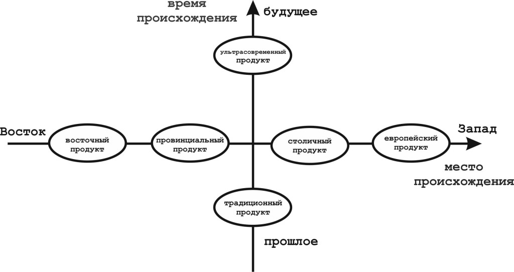Этот вариант, в качестве дополнительного к позиционированию в осях цена-качество, очень распространен на рынке продуктов питания, например. Визуально отобразить принцип поиска такого позиционирования можно через две оси координат – «время происхождения» (прошлое-настоящее-будущее) и «место происхождения» (Восток – Россия – Запад). После чего, расположить всех значимых конкурентов на рынке в этих осях координат и найти незанятое пространство, которое может занять ваш продукт. Тогда получается не просто «хороший» продукт, но «хороший традиционно русский» или «хороший современный европейский» продукт. Даже такое подобие уникальности позволяет выделить на рынке и более эффективно сформировать стереотип в сознании потребителя.