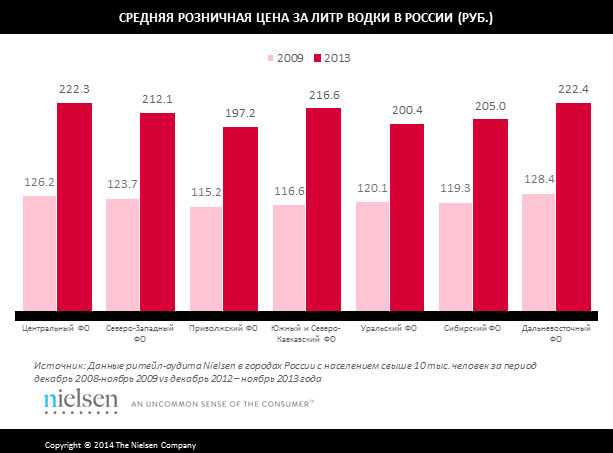 Объем рынка водки в России в 2013 году сократился на 18% в натуральном выражении по сравнению с 2012 годом и на 27% по сравнению с 2009 годом, свидетельствуют данные Nielsen. Падение рынка сопровождается ростом цен на водку: ее средняя цена в России за четыре года (с 2009 по 2013 год) выросла на 75% с 121 рубля за литр до 212 рублей.