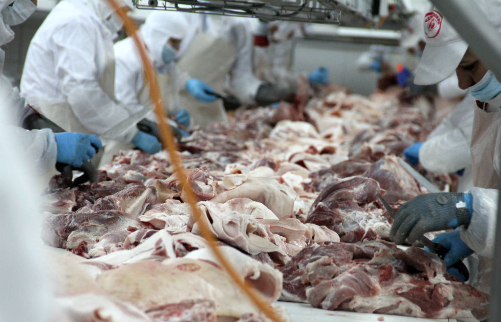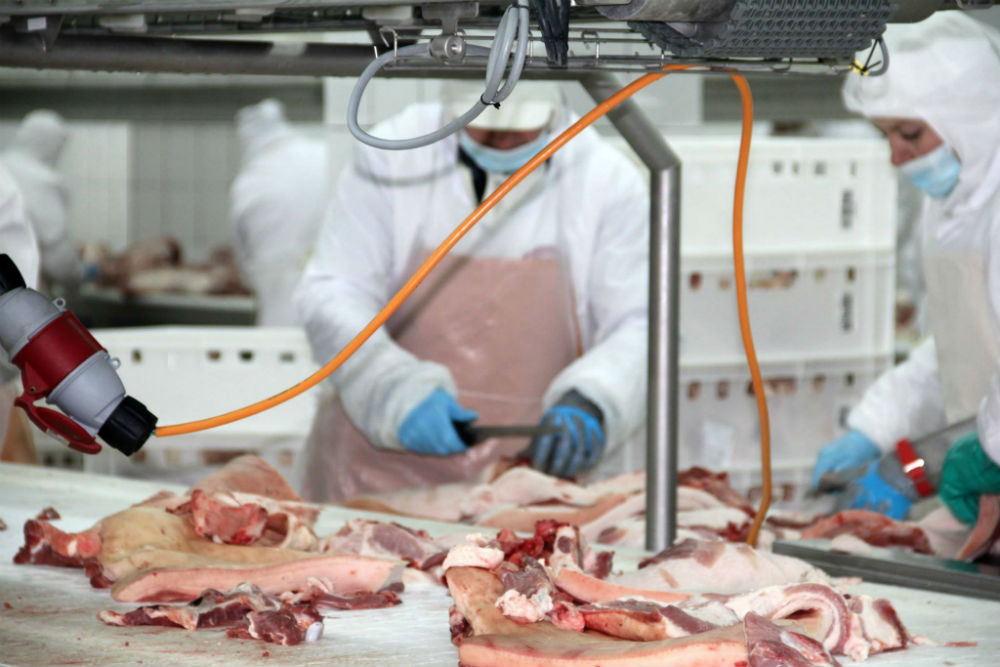 Мясо поступает к обвальщикам с соседнего участка, куда прибывают свиные полутуши. Там работники разрезают полутуши на более мелкие части c помощью оборудования Schaller.