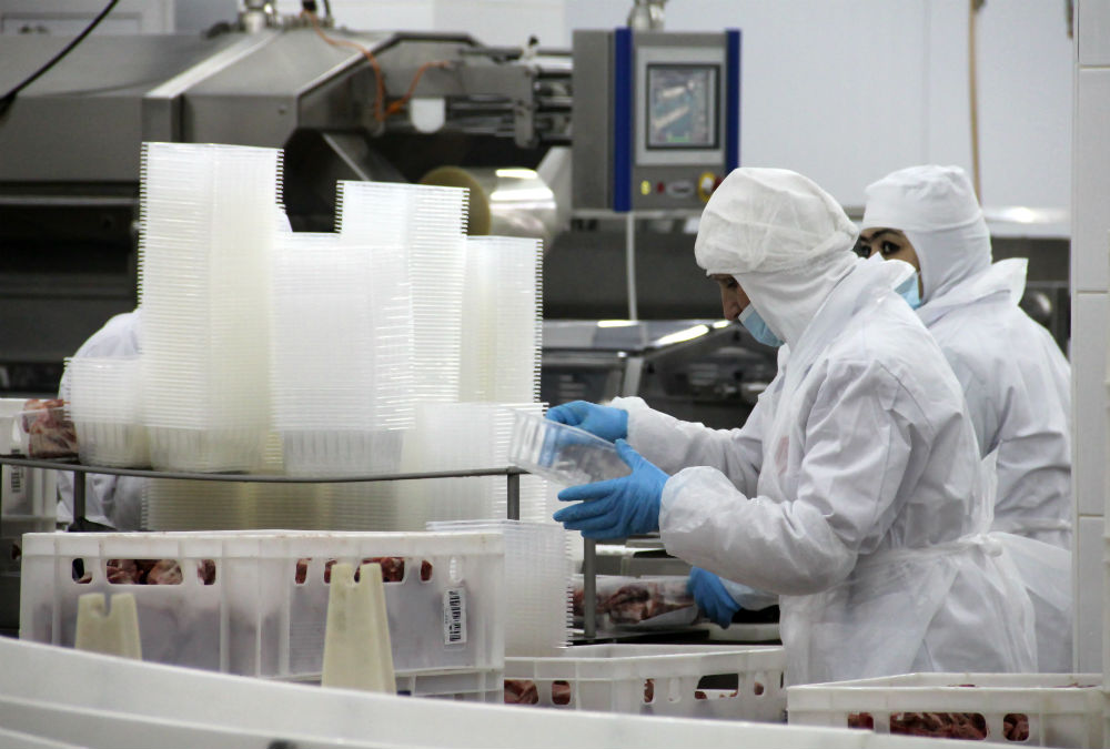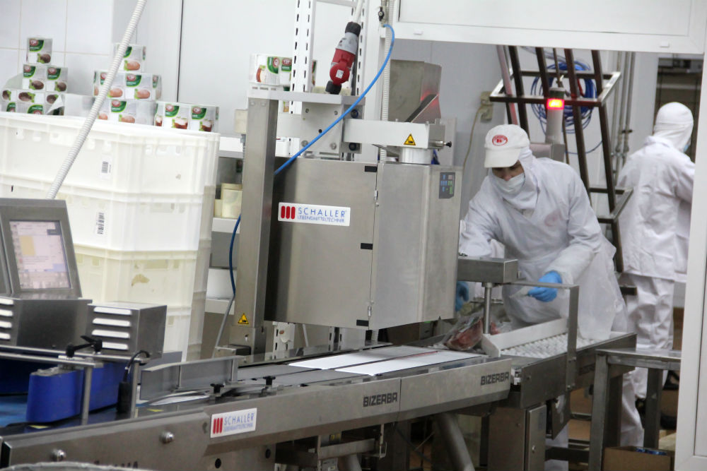 Упаковка, так или иначе, присутствует на комбинате везде. Это важная часть современного производства. Вот цех полуфабрикатов. Здесь установлено упаковочное оборудование производства испанской фирмы Ulma, нарезка производится на немецкой технике. В этом цехе изготавливают стейки, которые готовятся в микроволновке прямо в упаковке. В помещении очень низкая температура – плюс 2°С, что обеспечивает гарантию соответствия стандарту качества мяса по микробиологии. В цехе несколько линий. На них выпускают стейки, есть две линии, где выпускают мелкокусковые полуфабрикаты в лотках. Есть вакуумная линия. Набивочные машины подают фарш, и под вакуумом порция продукта попадает в лоток.
