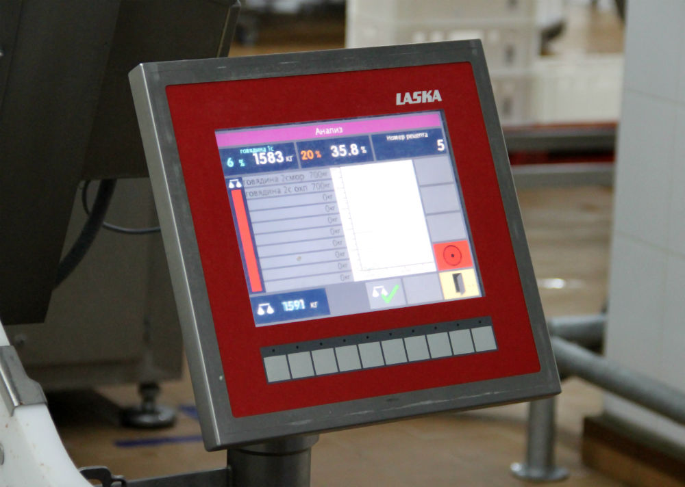 Здесь же работает волчок фирмы Laska – крупная промышленная мясорубка, способная измельчать мороженое мясо. В нее как раз загружали тяжелые блоки из замороженной говядины. Со стороны подачи на машине установлена рамка металлодетектора, способного обнаруживать в мясе металлические включения. Оборудование отличное, но, по словам главного технолога, случаев попадания металлических инородных тел на его памяти не было, потому что завод работает с надежными поставщиками. Тем не менее, для обеспечения стандарта качества металлодетектор необходим.
