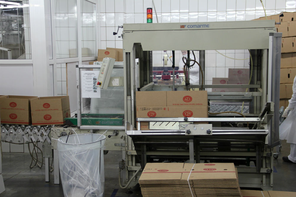 Здесь готовую колбасу укладывают в коробки и заклеивают клейкой лентой.