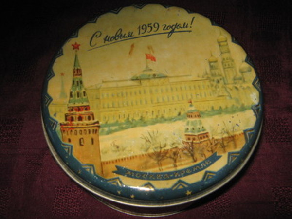 В новогоднем оформлении советской продукции часто использовался пейзаж. А среди пейзажных сюжетов наибольшей популярностью пользовалось изображение Московского кремля или его Спасской башни с курантами. Вот как выглядела жестяная коробка с кондитерскими изделиями, «поздравлявшая» с наступающим 1959 годом: