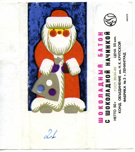Как и сейчас, на новогодних этикетках изображались Дед Мороз и Снегурочка. Например, на этикетке шоколадного батончика: