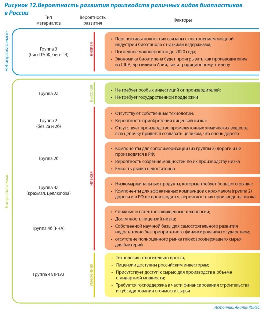 Абстрагируясь от аспектов, связанных с фактически несуществующим внутренним рынком и общими рисками промышленных инвестиций в России, качественный анализ ключевых факторов успеха проектов по созданию производств биопластиков показывает, что единственным направлением, заслуживающим внимания инвесторов, являются полимеры группы 4в, то есть полимолочная кислота (Рис. 12). Ключевыми предпосылками являются следующие: доступность технологий (в том числе разработанных иностранными компаниями, контролируемыми российским бизнесом); относительно низкие капитальные затраты, возможность сконцентрировать достаточный объем сырья для загрузки производства стандартной мировой мощности.