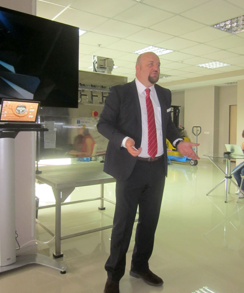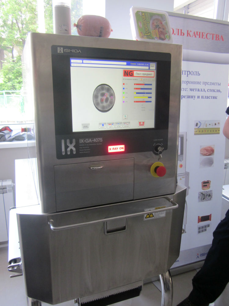 Впечатляют возможности рентгеновской установки Ishida для обнаружения инородных включений в продуктах. Вообще, заниматься рентгеновскими дефектоскопами компания начала в 2005 г. По словам Олега Боричевского, рентгеновские машины Ishida видят всё, что тонет в воде, а именно кости, стекло, плотный пластик и пр. На пищевом производстве возможно всякое. Скажем, из разряда ужасов: упал телефон на пол, осколки стекла попали в ёмкость с колбасным фаршем. Тут только один выход – прогнать всю партию колбасы через систему рентгеновского контроля Ishida IX-GA.
