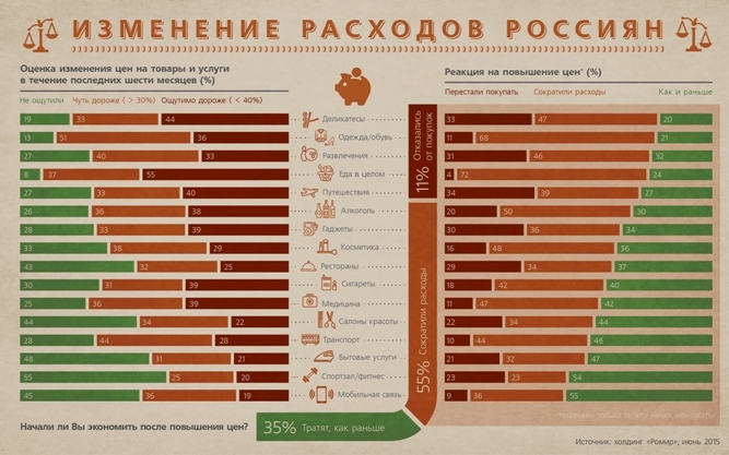 Две трети россиян признались, что в связи с повышением цен за последние шесть месяцев они перешли в режим экономии или даже отказались от некоторых товаров и услуг. В первую очередь под сокращение расходов попали деликатесы (80%), одежда и обувь (79%) сфера развлечений (77%) и путешествия (73%), а также продукты питания в целом (76%). Расходы на подорожавший алкоголь сократили 70% респондентов, а на сигареты – 60%. Наиболее экономными оказались жители малых городов страны, а также респонденты Северо-запада и Урала.