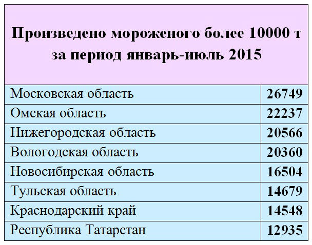 По последним данным госстатистики, за период с января по июль 2015 года в России выпущено 268604 тонн мороженого, что составляет 99,3% по сравнению с аналогичным периодом 2014 года.