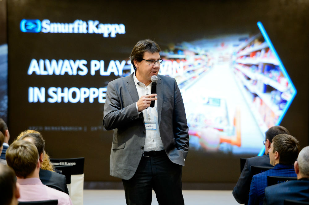 Победе в потребительском маркетинге был посвящен доклад Вице-президента по инновациям и развитию Smurfit Kappa Арко Беркенбоша (Arco Berkenbosch). Он рассказал о важнейшей роли, которую готовая к выкладке упаковка (Shelf ready packaging - SRP) играет в повышении узнаваемости товаров на полке и принятии потребителем решения о покупке. По его словам, такая упаковка значительно лучше идентифицируется потребителем и помогает влиять на процесс выбора. Согласно исследованиям Smurfit Kappa, 76% решений о покупке принимаются непосредственно в магазине и сегодня требуется все больше усилий, чтобы привлечь внимание потребителей. В среднем, покупатель тратит всего 15 секунд на каждую категорию товаров, при этом он форсируется на каждом POS-материале всего на полторы секунды и запоминает меньше 40% представленных на полке товаров.