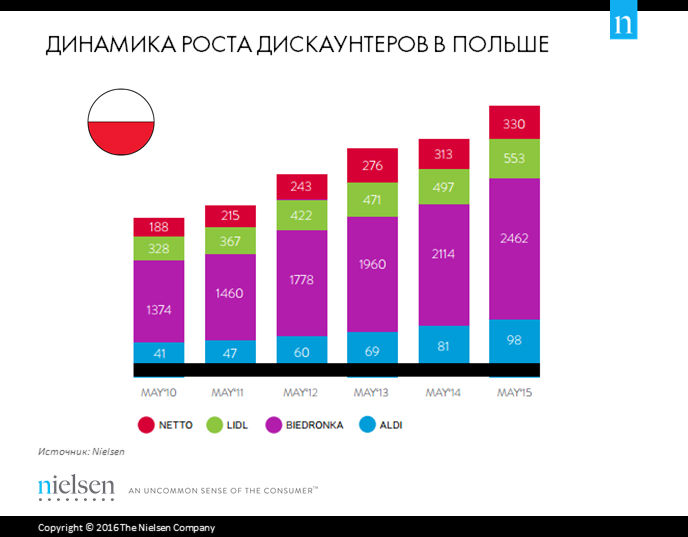 Схожий тренд мы наблюдаем и в другом конце Европы. На растущих рынках Восточной Европы, таких как Польша и Венгрия, мы видим даже более уверенные темпы продаж и рост доли дискаунтеров. И, что примечательно, вопреки общепринятому мнению, рост происходит не за счет открытия новых магазинов, а за счет увеличения расходов на рекламу. В Венгрии количество рекламных размещений со стороны сетей дискаунтеров выросли с 27,328 в 2012 до 248,780 в 2014, а доля дискаунтеров в продажах выросла с 32% до 45%.