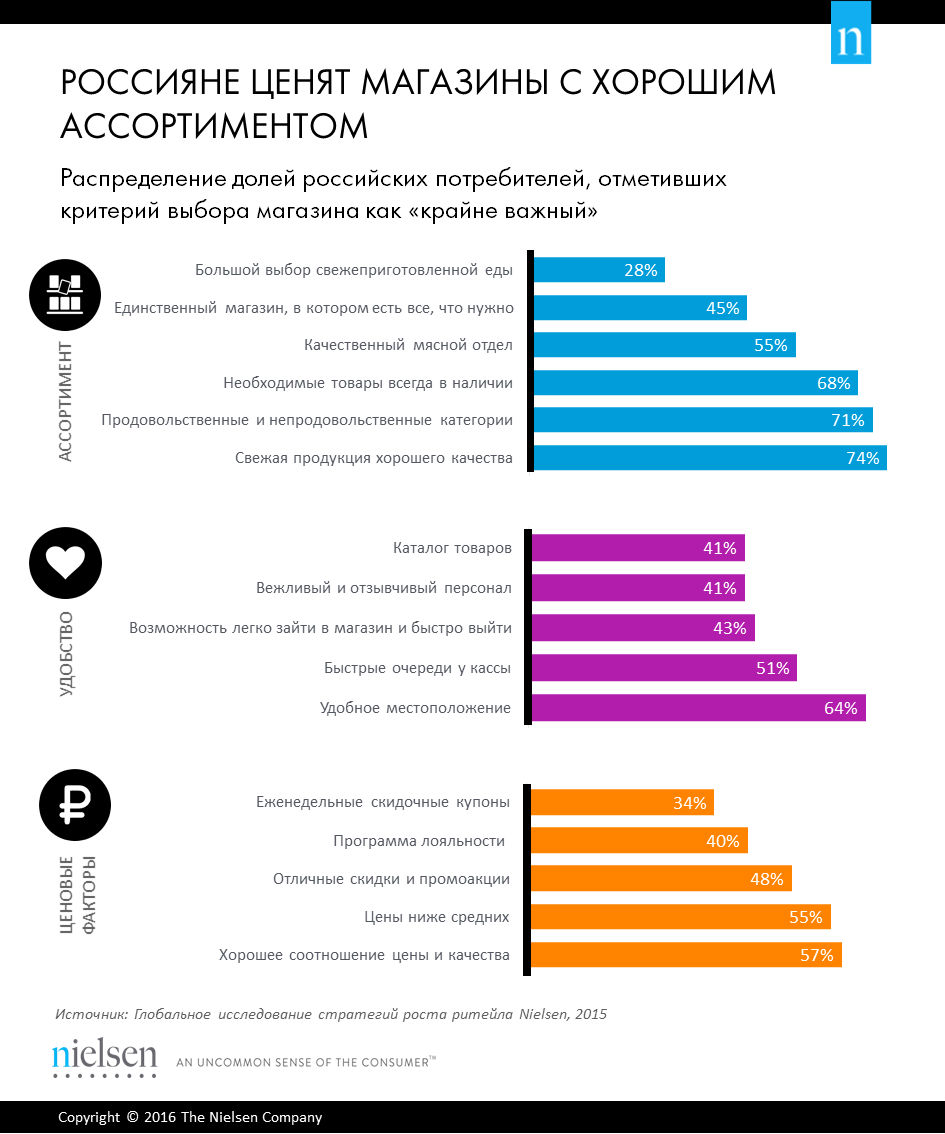 В России наблюдается схожая тенденция: наиболее важными характеристиками магазина являются свежая продукция хорошего качества (74%), предложение товаров как продовольственных, так и непродовольственных категорий (71%), постоянное наличие необходимых товаров (68%), а также удобное местоположение (64%). Среди ценовых факторов 57% россиян выделили хорошее соотношение цены и качества.