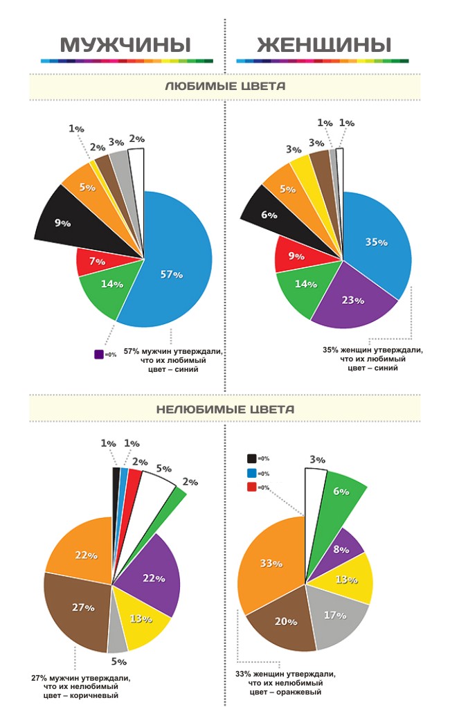 Выбирая цветовое решение, имеет смысл обратить внимание на любопытные результаты, полученные учеными, исследовавшими цветовые предпочтения мужчин и женщин. Согласно данным, полученным в 2003 году Джоном Хеллоком в ходе опроса 232 респондентов из 22 стран мира, самым популярным цветом стал синий. Его признали любимым 35% женщин и более половины опрошенных мужчин. К таким же выводам пришли и в 2007 году психологи Анна Хелберт и Ежи Линг. В дополнение к этому ученые заметили, что когда женщинам нужно было сделать выбор из цветовых оттенков, они всё-таки отдавали предпочтение оттенкам, близким к красному или розовому цвету. Также женщинам больше нравились яркие тона, а мужчинам наоборот – более спокойные, мягкие оттенки. Кроме того мужчины чаще, чем женщины, предпочитали белый, черный и серый цвета, а женщины напротив, благоволили цветным оттенкам. Психологи объясняют это склонностью женщин к «цветной», эмоционально насыщенной жизни. Упомянутая ранее Терри Гольдштейн также рекомендует использовать для женской упаковки полупрозрачные краски, умеренную яркость, плавные градиенты, преломляющийся свет и белый фон.
