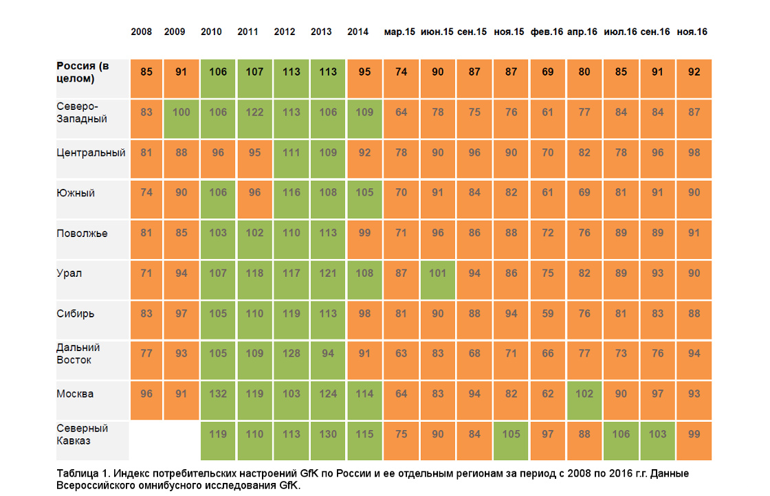 В ноябре 2016 года Индекс потребительских настроений GfK в целом по России составил 92 пункта, что всего лишь на один пункт больше, чем в сентябре (91). Таким образом, Индекс в IV кв. 2016 года остался в негативной зоне, но этот результат все же разительно отличается от показателей Индекса в I кв. 2016 года, когда Индекс упал практически до уровня предыдущего кризиса в 2009 году.