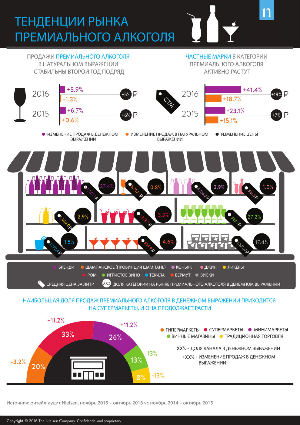 На российском рынке продажи премиального алкоголя (база крепкого алкоголя, не включая водку, с учетом шампанского и игристого вина) в натуральном выражении стабильны второй год подряд: за период с ноября 2015 по октябрь 2016 показатель прироста составил +1,3% против +0,6% за тот же период прошлого года, согласно данным Nielsen. В денежном выражении продажи демонстрируют рост: +5,9% — в 2016 году, +6,7% — в 2015. Цены в категории премиального алкоголя продолжили расти, но темпы немного замедлились: с 6,2% в прошлом году до 4,5% в 2016 году.