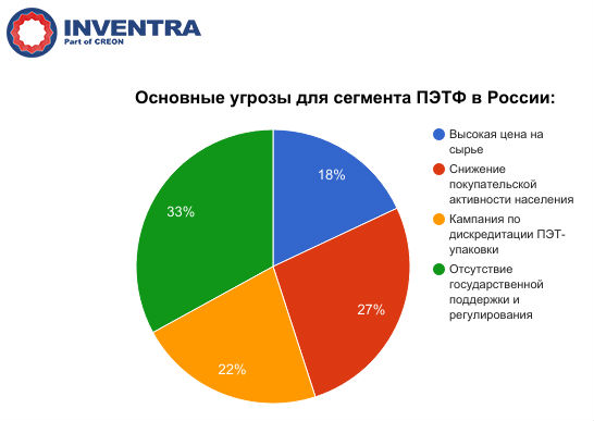 На данный момент прогнозы по сегменту - сдержанно-оптимистические, тем не менее, существует ряд потенциальных угроз. Среди них можно выделить отсутствие государственной поддержки и нормативного регулирования, кампанию по дискредитации ПЭТ-упаковки в России, снижение покупательской активности населения и высокую стоимость сырья. Примечательно, что именно первые три угрозы были признаны участниками конференции наиболее опасными: